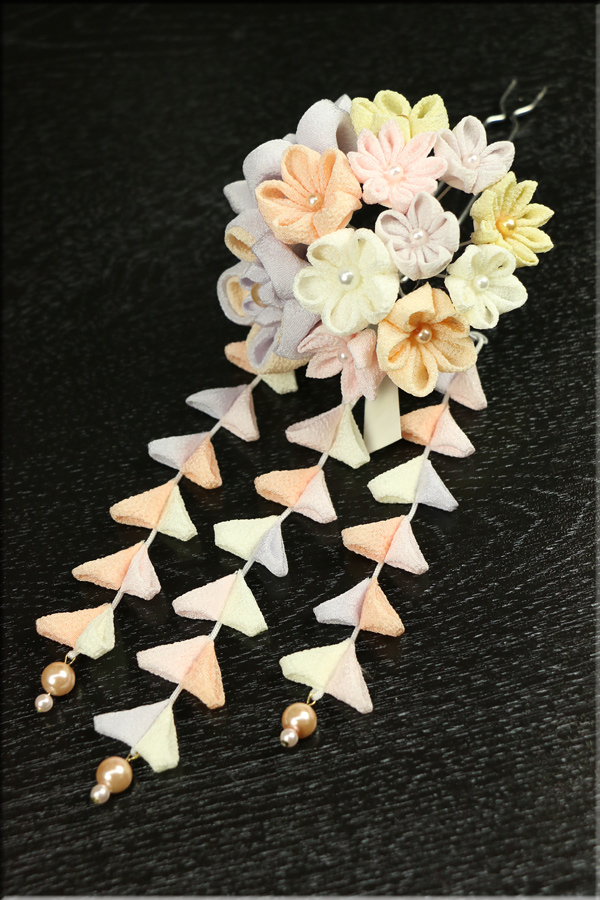 かんざし 縮緬つまみ細工 花かんざし下がり藤付 6花3本 パステル 2787a